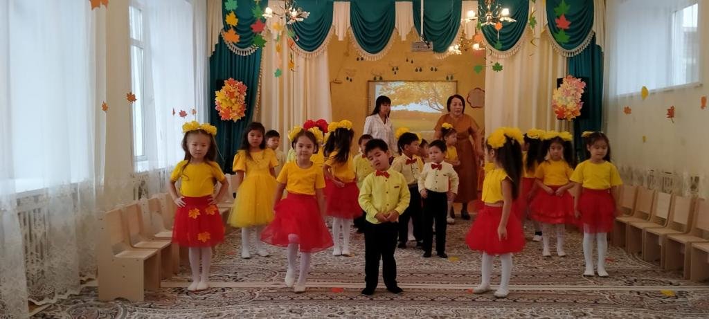 Мақсаты : Күз мезгілінің өзгерістерін ұғындыру,мерекелік көңіл -күй орнату. Балаларды ән салуға, би билеуге деген ынталарын арттыру. Зал мерекеге сай безендірілген .Әдемі ән ойналып тұрады . Бүлдіршіндер, тәрбиешімен бірге кіріп орындықтарға жайғасады. Балалардың қолдарында жапырақтар.